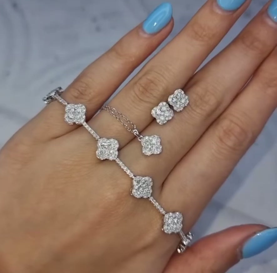 Our Diamond Clover Set sparkles with a luminescent elegance. These three pieces of fine jewelry feature 18 karat gold with a diamond clover design in the earrings, bracelet, and pendant. Add a touch of class to your everyday look with these stunning pieces.